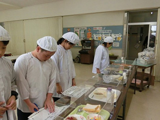 全国学校給食週間にあわせて、年代別献立サンプルを展示しました。生徒たちは、興味津々に眺め「昔はコッペパンがこんなに大きいとは思わなかった。」「勉強になった。」などの感想がありました。教員も自分自身の給食の思い出を生徒へ話しながら、懐かしそうに眺めていました。全校で給食に関心を持つ良い機会となりました。