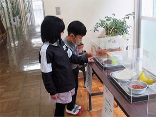 2月2日の参観会に合わせて、学校給食年代別献立レプリカを展示しました。同校は、今年度開校50周年を迎えたこともあり、昔の給食に興味を持つ児童が多く見受けられました。また食育に関するクイズも併せて掲示したことから、食に関する関心を高めるよい機会となりました。