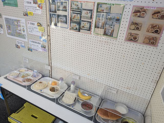 子どもからお年寄りまでを対象とした市内のイベントにあわせて、年代別献立レプリカを展示しました。